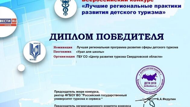 Подведены итоги Всероссийского конкурса «Лучшие практики развития детского туризма», организованного Торгово-Промышленной Палатой РФ, Российским государственным университетом туризма и сервиса (РГУТИС) и редакцией «Туризм» информационно-аналитического портала ВГТРК Вести.ру. На конкурс было подано почти 250 заявок из 36 регионов Российской Федерации и 75 городов и сельских поселений. Заявки и презентационные альбомы оценивало жюри в составе ведущих научных сотрудников РГУТИС, а также известных деятелей сферы детского туризма и отдыха. Проект «Урал для школы» стал одним из победителей в конкурсной номинации «Лучшая региональная программа развития сферы детского туризма». Напомним, этот проект стартовал на Среднем Урале в 2014 году. Тогда по инициативе и при поддержке министерства инвестиций и развития Свердловской области, и по заказу Центра развития туризма региона «Уральский государственный педагогический университет» разработал комплекты учебно-методических рекомендаций по организации экскурсионно-образовательных маршрутов по Свердловской области. Это дало возможность уральским школьникам организованно путешествовать по родному краю в рамках 21 туристического образовательного маршрута. Этой программой учтены все необходимые моменты образовательного стандарта, возрастные особенности школьников, мнения краеведов, экскурсоводов, педагогов, туроператоров. Проект «Урал для школы» отмечен дипломом финалиста национальной премии «Хрустальный компас». Как рассказали в Центре развития туризма Свердловской области, cсегодня этот проект реализуют восемь сертифицированных туроператоров – представителей крупнейших туристических компаний нашего региона. За девять месяцев 2018 года в рамках «Урала для школы» туроператорами реализовано 299 туров, в которых приняли участие более 10,5 тысяч школьников, а в течение всего времени действия этой программы в ней приняли участие более 48 тысяч юных свердловчан. В 2019 году реализация проекта «Урал для школы» в Свердловской области будет продолжена.