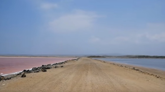 Путешественник из США Пол Дрекслер совершал тур по Колумбии о казался в районе Галеразамба, который расположен недалеко от соляной шахты. Здесь можно наблюдать удивительно явление: дорогу, разделяющую два цветных водоёма. В одной части вода привычного бирюзового цвета, а вот в другом розовато-оранжевого. Всё дело в том, что в этой части летом из-за повышения концентрации размножаются бактерии, придающие воду розовый оттенок. Окраска сохраняется пару месяцев, а потом вода снова приобретает зелёно-голубой цвет.