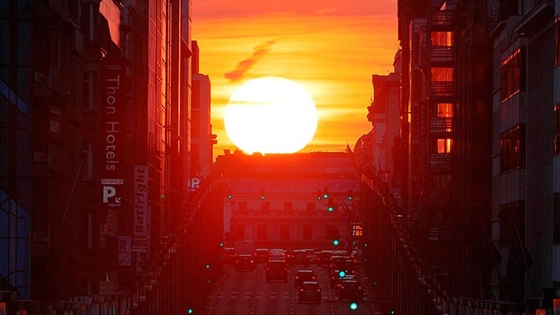 В Нью-Йорке в эти дни туристы могут наблюдать кровавый закат. Кровавый закат в Нью-Йорке могут наблюдать туристов и жителей города в эти дни. Тысячи туристов собрались на Манхэттене, чтобы стать свидетелями уникального небесного спектакля, поскольку подобная картина бывает там лишь четыре дня в году, и то, если позволяет погода. В эти дни огненный диск Солнца выстраивается с небоскребами в одну линию. Такой закат жители Нью-Йорка называют «Манхэттен-хэндж» - по аналогии со знаменитым британским Стоунхенджем. Желающих увидеть и сфотографировать природное явление в этом году было особенно много, что вызвало даже затруднения в работе транспорта.