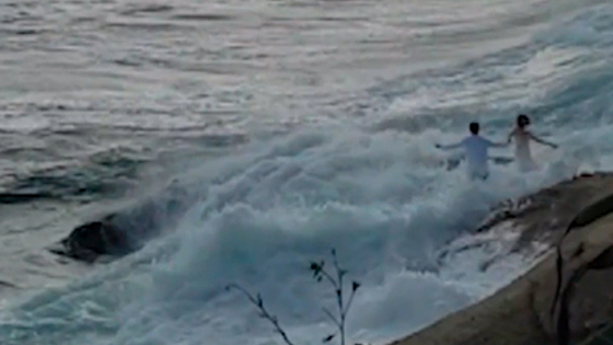Молодожены оказались в воде, когда фотографировались на пляже. Происходящее заметил очевидец, который снимал их с возвышенности. Он немедленно стал звать на помощь.