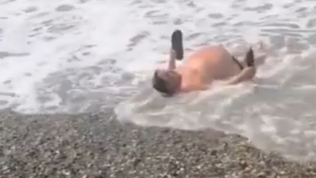 В Сочи на берег вынесло нетрезвого туриста со сланцами в руках. Проходящие мимо отдыхающие сняли мужчину на видео. Ролик опубликован на сайте телеканала Sochi24. На кадрах видно, как мужчина валится на спину из-за сильного течения, а затем его прибивает к берегу животом кверху. При этом он крепко держит в руках обувь, но его плавки сползли и оголили интимные части тела. По мнению авторов видео, отдыхающий был изрядно пьяным, так как передвигался с трудом. Тем не менее, поскольку его жизни ничего не угрожало, туристу не стали помогать подняться.