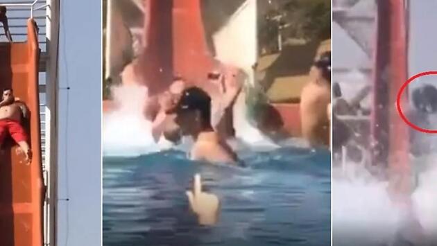 Трагикомичный инцидент был запечатлён проводящей свой отпуск в бассейне туристкой. Страдающий от ожирения любитель водного экстрима скатился в аттракциона и буквально снёс появившегося на его пути молодого человека в бейсболке. Туристу не повезло и он вынырнул прямо перед несущимся на него грузным экстремалом, который врезался в живое «препятствие» и лишил его головного убора.