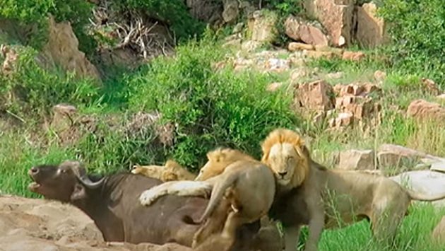 Львы загнали буйвола в смертельную ловушку и попали на видео