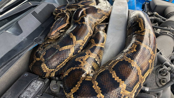 Владелец голубого Ford Mustang обнаружил змею, когда завёл автомобиль и услышал нехарактерные звуки из моторного отсека. Оказалось, что под капотом свернулся в клубок тигровый питон — очень крупная неядовитая змея, которая непреднамеренно заселилась в штате Флорида в результате деятельности человека.