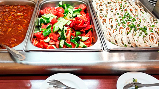 При этом на второе в ассортименте были представлены как мясные и рыбные блюда, так и, к примеру, пельмени, плов, вареники. Кроме того, в наличии имелись разнообразные гарниры — от гречки до овощного рагу, а также фрукты и выпечка на десерт.
