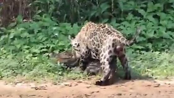 Ягуар поймал на берегу реки 36-килограммового каймана. Рептилия пыталась вырваться. На мгновение большая кошка расслабила челюсти и отпустила его на траву. Тогда кайман попытался воспользоваться моментом, чтобы уползти от хищника.