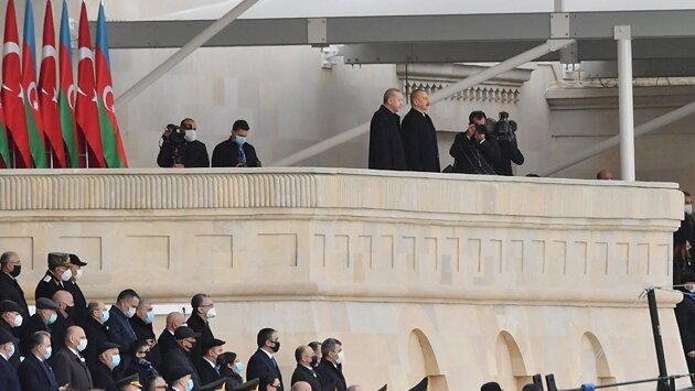Сегодня исторический день. Сегодня на площади Азадлыг проходит парад победы. Очень рад, что, приняв мое приглашение, на параде присутствует президент Турецкой Республики, мой дорогой брат Реджеп Тайип Эрдоган. В то же время в параде участвуют прибывшая из Турции представительная делегация, турецкие солдаты и офицеры. Это еще раз демонстрирует наше единство, дружбу и братство.