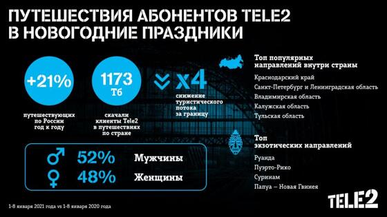 Самым популярным внутренним направлением российских абонентов в новогодние каникулы стал Краснодарский край: зимой сюда чаще всего едут на горнолыжные курорты. У приморских клиентов оператора Кубань заняла только 8-е место в рейтинге новогодних поездок. На 2-м месте общероссийского рейтинга – Санкт-Петербург и Ленинградская область. Также в топ-10 попали Татарстан, Тверская, Свердловская, Рязанская и Нижегородская области. В этом году в поездках по России клиентам Tele2 понадобилось в 2 раза больше мобильного Интернета, чем годом ранее. Россияне скачали 1173 Тб интернет-трафика.