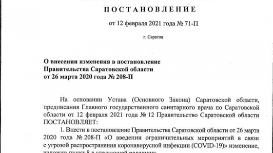 Режим обязательной самоизоляции для жителей Саратовской области старше 65-и лет продлили до 1 марта 2021 года. Соответствующее постановление, подписанное председателем правительства региона Романом Бусаргиным, сегодня, 12 февраля, опубликовано в Telegram-канале пресс-службы губернатора.