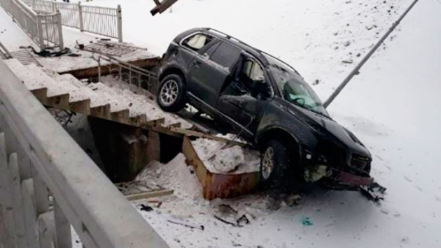 Опубликовано видео с места падения внедорожника с эстакады на крышу электропоезда в Московской области. На опубликованных в Сети кадрах виден автомобиль, который лежит у платформы и электричка. На первый взгляд она не получила серьезных повреждений.