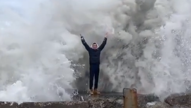 На видео молодые люди стоят на краю набережной и поднимают руки, когда волны бьются о камни.