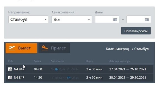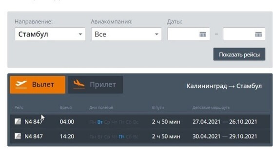 Чартерные авиарейсы из Калининграда в Стамбул запустят 27 апреля. Об этом говорят данные онлайн-табло Храброво.