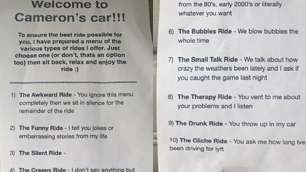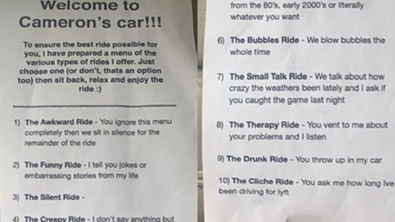 Изображение меню на Reddit стало вирусным и собрало несколько тысяч комментариев. Теперь люди мечтают спеть с таксистом в караоке, рассуждают, какому путешествию отдать предпочтение, и надеются, что подобное меню появится в других такси.