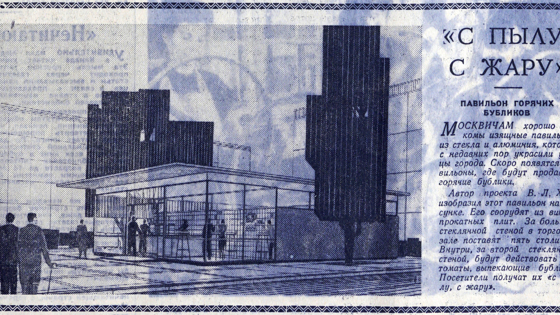 Также в Москве 1961 года появились стеклянные павильоны горячих бубликов. Автором проекта выступил архитектор Владимир Хайт. Внутри павильон был разделен стеклянной стеной, где с одной стороны расположились пять столиков, а с другой находятся автоматы, выпекающие бублики. Вот такая новинка «с пылу, с жару».