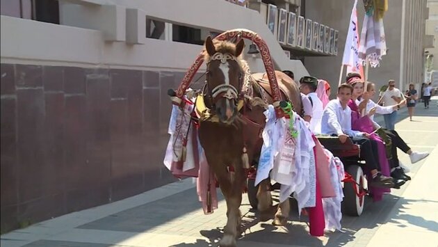 Сегодня в Казани прошло праздничное шествие со сбором подарков на татарский праздник Сабантуй. 10 повозок с артистами проехали по центральным улицам города и финишировали у театра Камала. Здесь прошли праздничный концерт и театрализованное представление по пьесе "Голубая шаль" Карима Тинчурина,