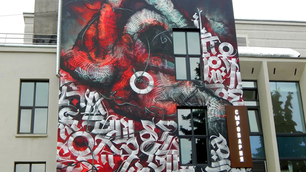 А на фасаде концертного зала «Юпитер» находится работа одного из самых известных художников России, который популярен также за рубежом. Это Покрас Лампас, в граффити которого имеются элементы каллиграфии. Он даже является создателем самой большой в мире каллиграфии. Работу можно увидеть в Москве на крыше завода «Красный Октябрь».