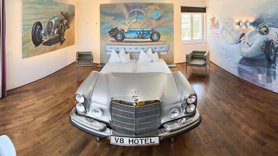 В настоящее время существует множество детских кроватей, выполненных в автомобильной тематике. К примеру, популярностью пользуются спальные места, стилизованные под героев мультфильма «Тачки». Однако владельцы немецкого V8 Hotel пошли ещё дальше, оборудовав номера гостиницы полноразмерными взрослыми кроватями, выполненными из самых разнообразных автомобилей.