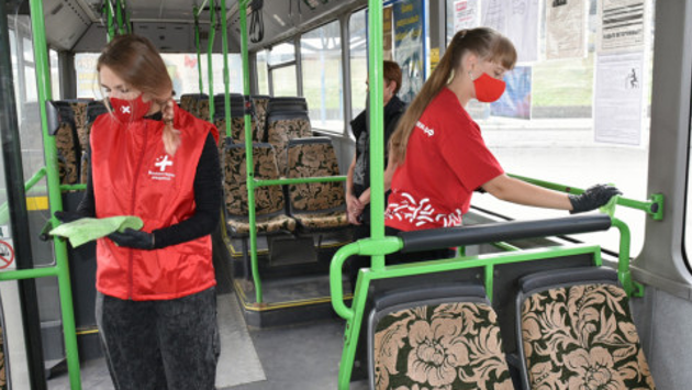 Добровольцы на конечной остановке «Спартак» тщательно вымыли поручни, спинки сидений, обработали салон общественного транспорта маршрута №57 и готовы помогать водителям с этим постоянно.