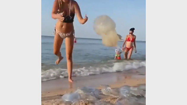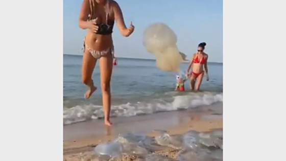 На размещенных в сети кадрах видно, как беременная женщина пытается очистить место для купания, вынося из воды огромных медуз и бросая их на берег.
