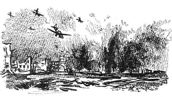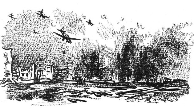 «Немцы летят прямо на нас. Они летят треугольником, как перелетные гуси. Летят низко – видны желтые концы крыльев, обведенные белым кресты, шасси, точно выпущенные когти. Десять… двенадцать… пятнадцать… восемнадцать штук… Выстраиваются в цепочку. Как раз против нас. Ведущий переворачивается через крыло колесами вверх. Входит в пике. Я не свожу с него глаз. У него красные колеса и красная головка мотора. Включает сирену. Из-под крыльев вываливаются черные точки. Одна… две… три… четыре… десять… двенадцать… Последняя белая и большая. Я закрываю глаза, вцепляюсь в перила. Это инстинктивно. Нету земли, чтобы в нее врыться. А что-то надо. Слышно, как «певун» выходит из пике. Потом ничего нельзя уже разобрать.
