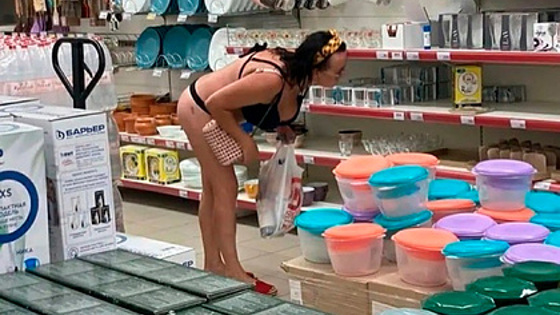 На опубликованных кадрах видно, как женщина с влажными волосами в раздельном черном бикини ходит по супермаркету и совершает покупки.