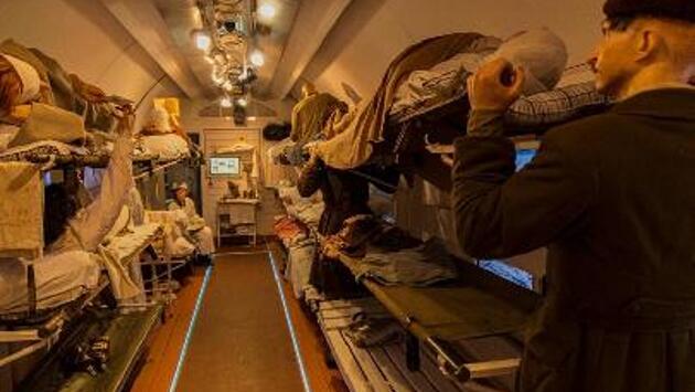 «Поезд Победы» – это первая в мире иммерсивная инсталляция, размещенная в подвижном составе. Поезд состоит из девяти выставочных вагонов, каждый из которых посвящен отдельному периоду 1940-х годов. В основе экспозиции – трехмерные панорамы команды молодых художников «Невский баталист»: 13 тем и более 150 скульптур героев с неповторимыми образами. Выставка дополнена уникальным мультимедийным сопровождением. В экспозиции используется объемный звук, театральное освещение, механические спецэффекты, панорамы боев в виртуальной реальности, киносъемка исторических реконструкций, трехмерная компьютерная графика с моделями военной техники.