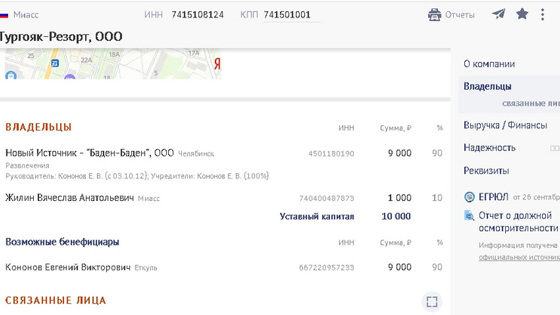 ООО «Тургояк-Резорт» внесено в базу данных ЕГРЮЛ 27 августа. Согласно реестру, Жилину принадлежит 10% данного бизнеса, еще 90% — ООО «Новый источник — „Баден-Баден“». О качестве основной для фирмы заявлена зрелищно-развлекательная деятельность, но также предусмотрены и иные формы. Например, деятельность гостиниц и прочих мест для временного проживания; деятельность предприятий общественного питания, торговля сувенирами и алкоголем. Ранее было зарегистрировано ООО «Уреньга-Резорт» с аналогичным набором видов деятельности.