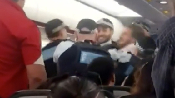 Поднявшийся на борт полицейский попытался задержать нарушителя, однако тот начал сопротивляться. Несмотря на перегородку, которая закрывает обзор, на кадрах можно увидеть, как между мужчинами завязывается драка. Сотруднику правоохранительных органов пришлось достать дубинку, позже ему на помощь подбежал другой пассажир — вместе им удалось обездвижить дебошира и надеть на него наручники.