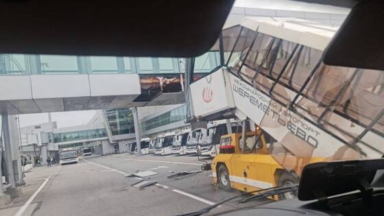 Информации о состоянии водителя или наличии пострадавших в результате столкновения не поступало. На фотографиях с места происшествия, размещенных в телеграм-канале «Авиадиспетчер», заметно повреждение нижней, неостекленной части перехода. Существенно пострадал и сам трап.
