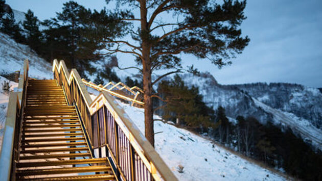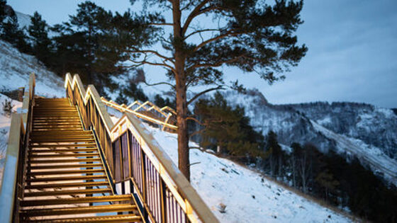 Напомним, что лестницу открыли 1 декабря. Она самая длинная в России: чтобы подняться на самую вершину, нужно пройти 1200 метров и 1683 ступени. Она начинается на территории лагеря «Гренада», где для удобства туристов оборудовали специальную площадку с навигацией, освещением, тёплым бесплатным туалетом.
