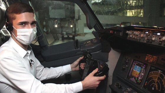 Затем Артем прошел инструктаж со всеми членами экипажа. Вместе с командиром самолета Сергеем Малиновским они осмотрели Boeing 737-800. Артему рассказали об особенностях управления авиалайнером, он изучал строение кабины пилотов, задавал вопросы и посидел на месте командира воздушного судна.