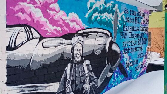 На рисунке изображен самолет Ла-5 и летчик-ас Иван Кожедуб, летавший на таком самолете в годы войны. Граффити сопровождает надпись: «За годы войны завод № 119 им. Г.М. Маленкова (ныне — НАО „Гидромаш“) выпустил 22 тысячи комплектов шасси к военным самолетам».
