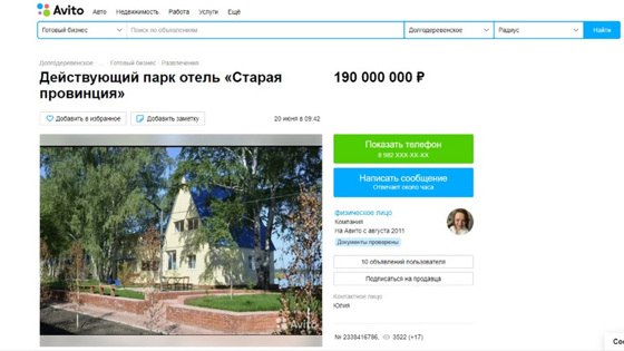 «Клубный отель „Старая провинция“ — это загородный комплекс на берегу озера Кумкуль в 30 км от Челябинска. Имеется комфортный оборудованный пляж, площадка для выездной церемонии и фуршета, банкетный зал. Есть отдельно стоящая застекленная летняя веранда на 120 персон, а так же клубный ресторан вместимостью до 80 персон. Стоимость отеля 190 млн рублей», — сообщается в тексте объявления «Авито».