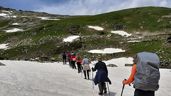 Группа под ее руководством идет совершать восхождение на гору Надежда (3 355 м) — здесь туристам уже нужны не только выносливость и готовность преодолевать трудности, но и специальное снаряжение для ходьбы по снежному рельефу — ледорубы, альпинистские "кошки" и веревки.