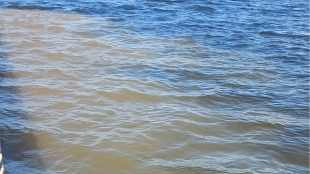 На фотографии заметно, что пятно грязно-желтого цвета заняло площадь в несколько десятков квадратных метров и растеклось непосредственно у берега.