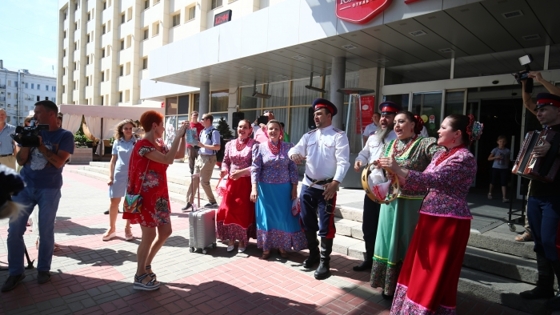 У парадного входа в отель «Южный», где разместились гости, их поджидали артисты народного ансамбля казачьей песни. Когда автобус с гостями подъехал к гостинице, по округе полетела их раздольная приветственная песня «Мы – донские казаки». Кинематографисты с улыбками начали выгружать свой багаж, а известная российская актриса, певица, телеведущая Оксана Сташенко прямо с чемоданом на колесиках пустилась в пляс.