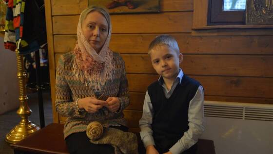 Москвичка Яна Шевченко вместе со своим сыном Анатолием пришла в храм на утреннюю службу. Вместе они ставят свечку за российских солдат, а затем молятся за здравие наших бойцов. После окончания службы Яна Шевченко достает из сумки теплые шерстяные носки и передает их представителю храма.