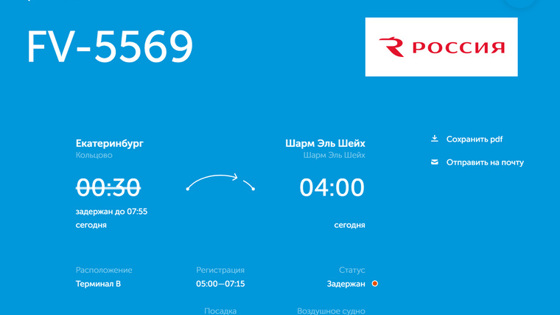 «Рейс FV-5569, следующий из Екатеринбурга в Шарм-эль-Шейх задержан до 7:55. Регистрация на борт пройдет с 05:00 до 07:15», — следует из онлайн-табло.