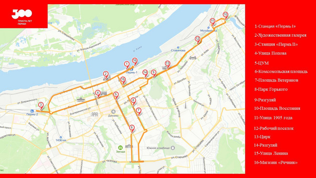 «Стартует рейс от станции „Пермь-1“, где можно будет сделать фото у нашего „Счастья не за горами“. Затем автобус проедет через Соборную площадь, эспланаду, Октябрьскую и Комсомольскую площади, монумент „МиГ на взлете“, по улицам Сибирской и Луначарского направится в Мотовилиху к Музею пермской артиллерии, после чего вернется на исходную точку», — пишет Демкин в соцсетях.