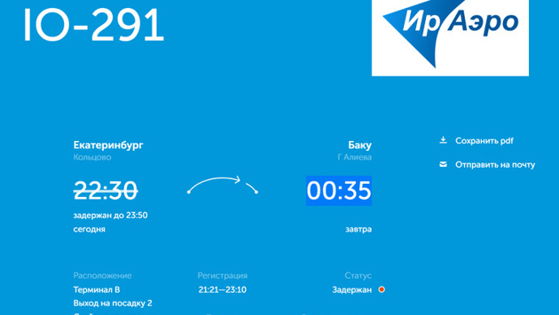 «В Екатеринбурге задержан самолет RRJ-95LR, летящий в Баку. Самолет „ИрАэро“ вылетит из Кольцово в 23:50», — следует из онлайн-табло Кольцово.