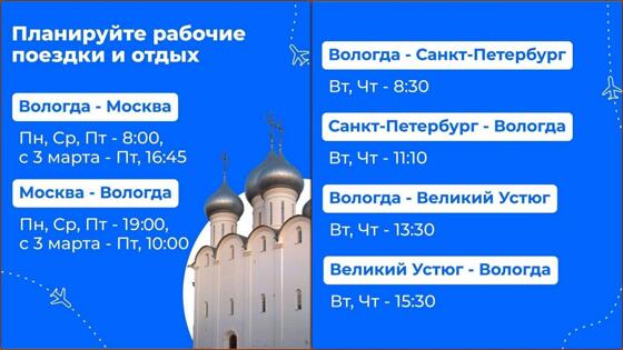 «С 3 марта по пятницам из областной столицы в Москву можно будет улететь в 08:00 и 16:45, а обратно — в 10:00 и 19:00. Решение приняли из-за большого спроса. С 2 марта начнут осуществляться регулярные рейсы в Великий Устюг из Санкт-Петербурга с остановкой в Вологде. Уверен, это еще один важный шаг к развитию туризма на Вологодчине», — говорит Губернатор Олег Кувшинников.