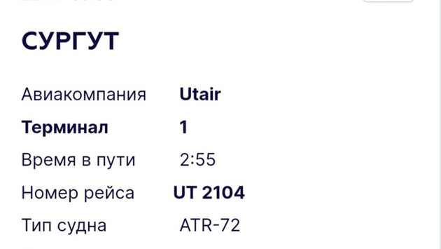 «Рейс UT-2104 вылет из Уфы в Сургут в 22:05 5 марта задержан. Вылетел в 6:54 6 марта», — сообщается на онлайн-табло аэропорта Уфы.