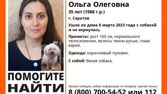 Найдена пропавшая ранее без вести в Саратове Ольга Железнякова. Как сообщили в поисковом отряде «Лиза Алерт», 6 марта 35-летняя женщина ушла из дома с собакой и перестала выходить на связь. Она была объявлена в розыск 9 марта. Сегодня, 26 марта, поисковики сообщили, что саратовчанка найдена в добром здравии. Где все эти 20 дней пропадала дама с собачкой — не уточняется.