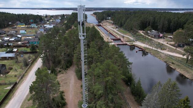 Вышка связи в Топорне стоит на берегу канала в сосновом бору. Так как населенный пункт имеет вытянутую форму, связисты установили более высокую базовую станцию, чем типовое решение для проекта УЦН 2.0. Это позволяет увеличить зону покрытия сети и обеспечить связью более 150 домохозяйств Топорни, а также прилегающие к ней территории.
