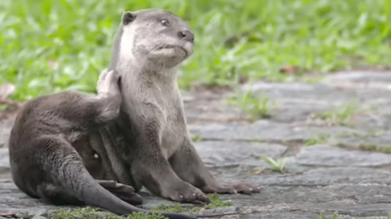 Зверёк неожиданно подплывает к серферам, плюхается на доску и угрожающе клацает зубами, сгоняя человека. Отобрать доску обратно не так-то просто. Затем выдра радостно катается сама или просто грызёт добычу.