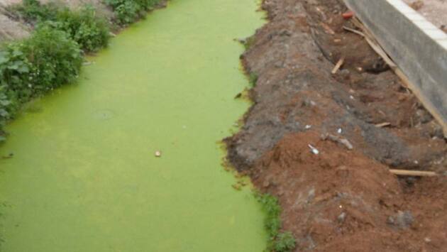 Ситуация усугубляется тем, что сама «река» зацвела, приобрела ярко-зеленый цвет и соответствующий запах.