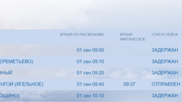 В аэропорту Салехарда 1 сентября задерживается прилет авиарейса из Тюмени, а самолет из Москвы ушел на запасной аэродром в Надым. Об этом URA.RU сообщили в справочной службе аэропорта окружной столицы.