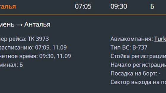 «Рейс TK 3973 по маршруту Тюмень — Анталья должен был вылететь в 7:05 11 сентября, однако был задержан до 9:30», — следует из данных табло. Причина задержки рейса на данный момент неизвестна.