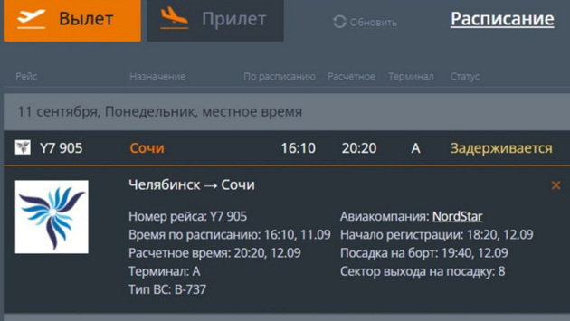 «Авиакомпания NordStar. Номер рейса — Y7 905. Время вылета 16:10 / 20:20, задерживается. Начало регистрации 18:20. Посадка на борт 19:40», — сообщается на онлайн-табло.