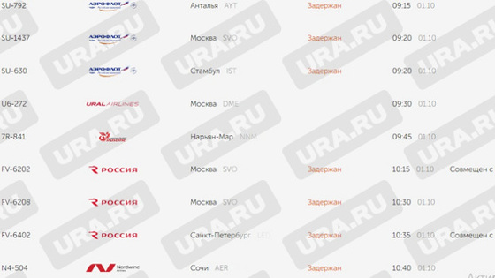 Рейсы в Москву SU-1437, FV-6202 и FV6208, лайнер в Анталью SU-792, борт в Стамбул SU-630, самолеты в Сочи N4-504 и в Санкт-Петербург FV-6402 задержаны, следует из данных на онлайн-табло аэропорта Кольцово. Точная причина задержки рейсов на данный момент неизвестна.